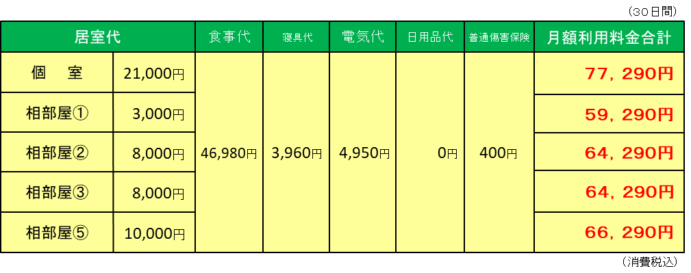 | 家賃相当額 相部屋①(1ヶ月当たり) | 合計 | 3,000円 |